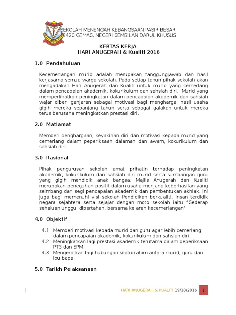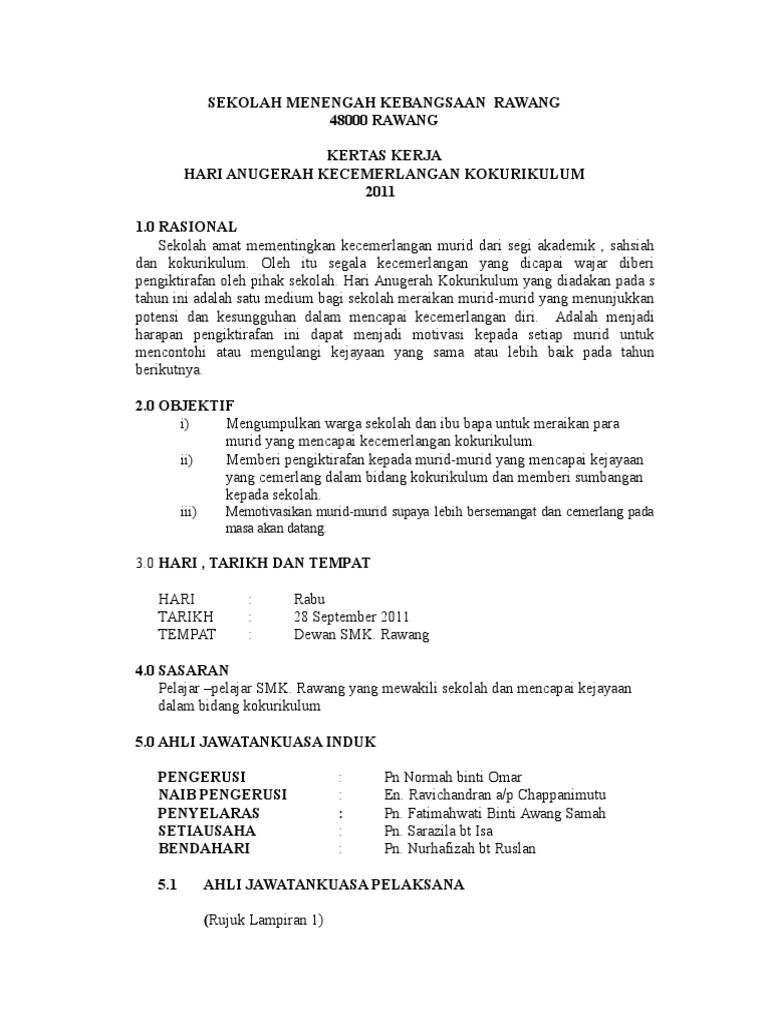 PENUTUP Kertas kerja disediakan dan dikemukakan kepada Tuan Guru Besar untuk mendapat kelulusan melaksanakan Majlis Hari Anugerah Kecemerlangan Murid 2019 dan memohon. SMK RAJA MUDA MUSA. Contoh serta format kertaskerja projek adalah seperti berikut.
